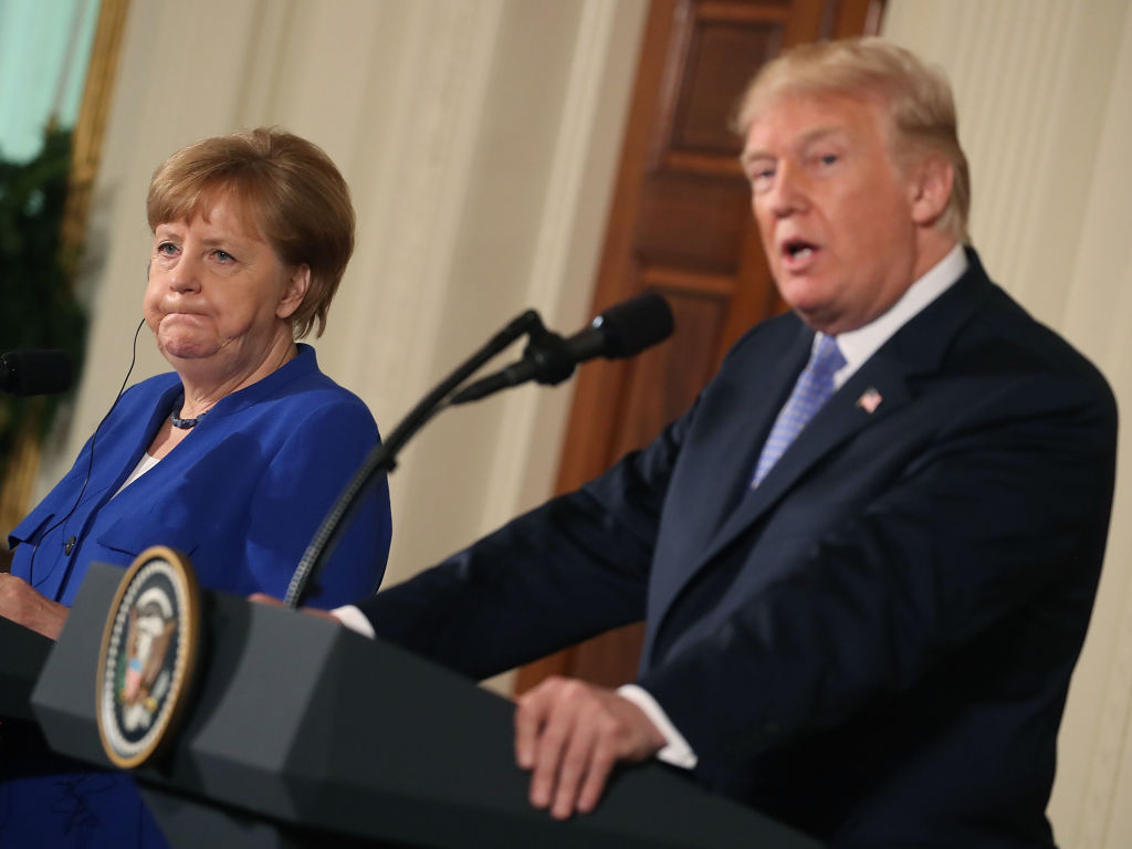 Germany's point-blank refusal to support Washington's proposal for a maritime protection force in the Arabian Gulf to protect shipping from attacks by Iran is yet another example of Berlin's diplomatic and economic sabotage of the Western alliance. Pictured: U.S. President Donald Trump and German Chancellor Angela Merkel at a press conference on April 27, 2018 in Washington, DC. (Photo by Mark Wilson/Getty Images)